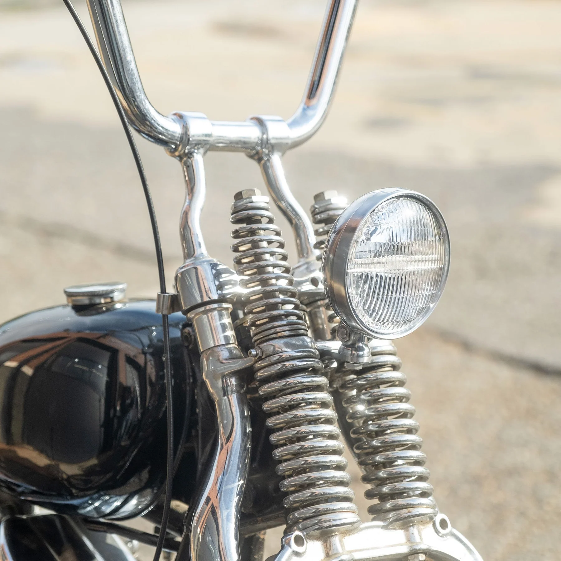 This headlamp features an LED lighting assembly that's not as susceptible to vibration damage as most halogen or incandescent units, but it doesn't have the spaceship look many traditionalists try to avoid. It has a defined high-beam cutoff in low-beam mode so you're not blinding oncoming traffic, and the cast housing and diffuser-type lens make this just an attractive, small headlight that looks just at home on a crusty, extended original springer as it does on a modern, polished stock machine. It's small, but unlike the lights of yore, that doesn't mean you have to give up illumination to have a crisp, clean front end appearance.