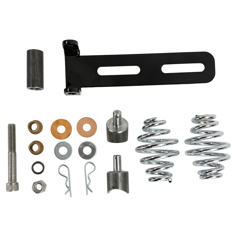 - Includes seat pivot, weld-on spring mounts, bushings, fasteners, coped mount bungs, and tongue spacer