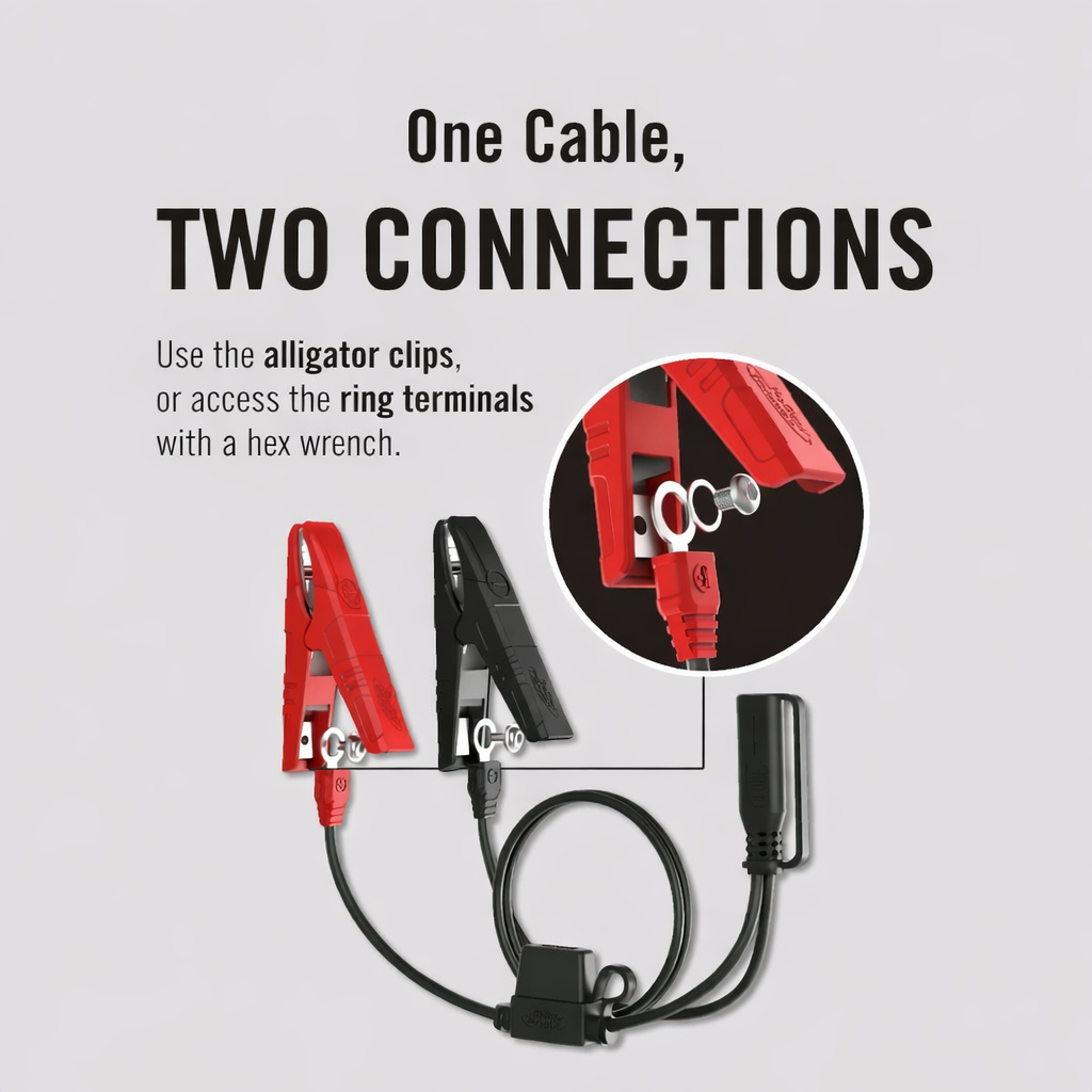 - Innovative two-way leads can be used as alligator clips or a conventional SAE connectors