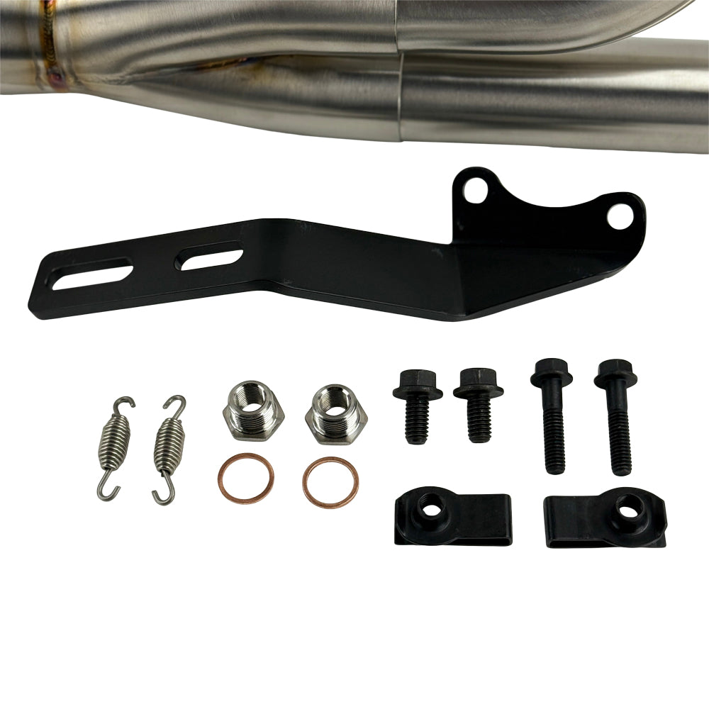 The exhaust will accept either 12mm or 18mm oxygen sensors; adapters are included so you can use either OE or aftermarket tuning setups. The mounting bracket and hardware are included. Exhaust spring clips are not included; they can be purchased separately. Exhaust gaskets are not included and should be replaced every time an exhaust system is removed; they also can be purchased separately.