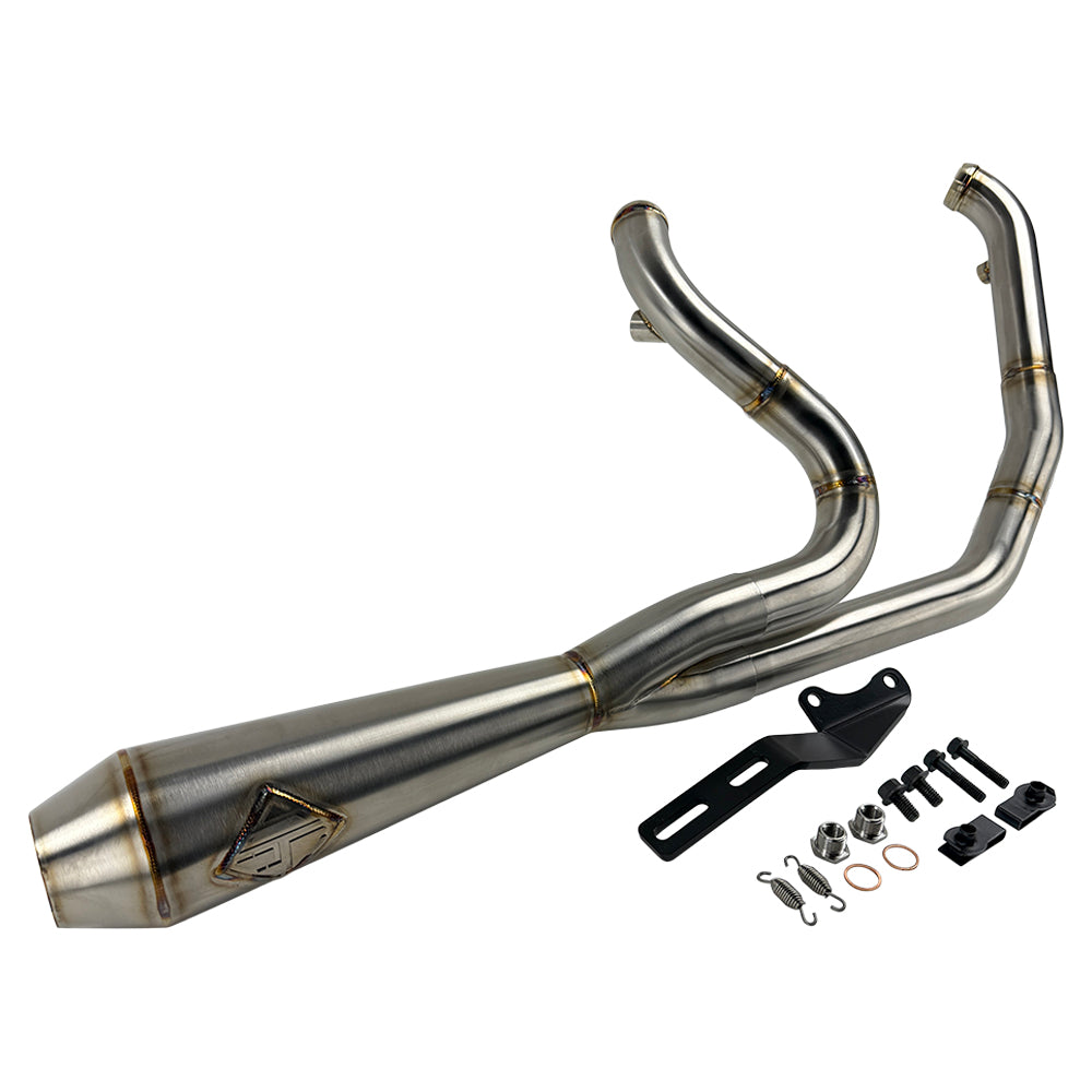 The LaneSplitter by SP Concepts is a high-and-tight 2-into-1 full exhaust system developed for Harley-Davidson Dyna motorcycles. Like most 2-into-1 pipes, performance is the reason this exhaust exists. With three-stage stepped head pipes and a short muffler, the LaneSplitter promotes exhaust velocity.